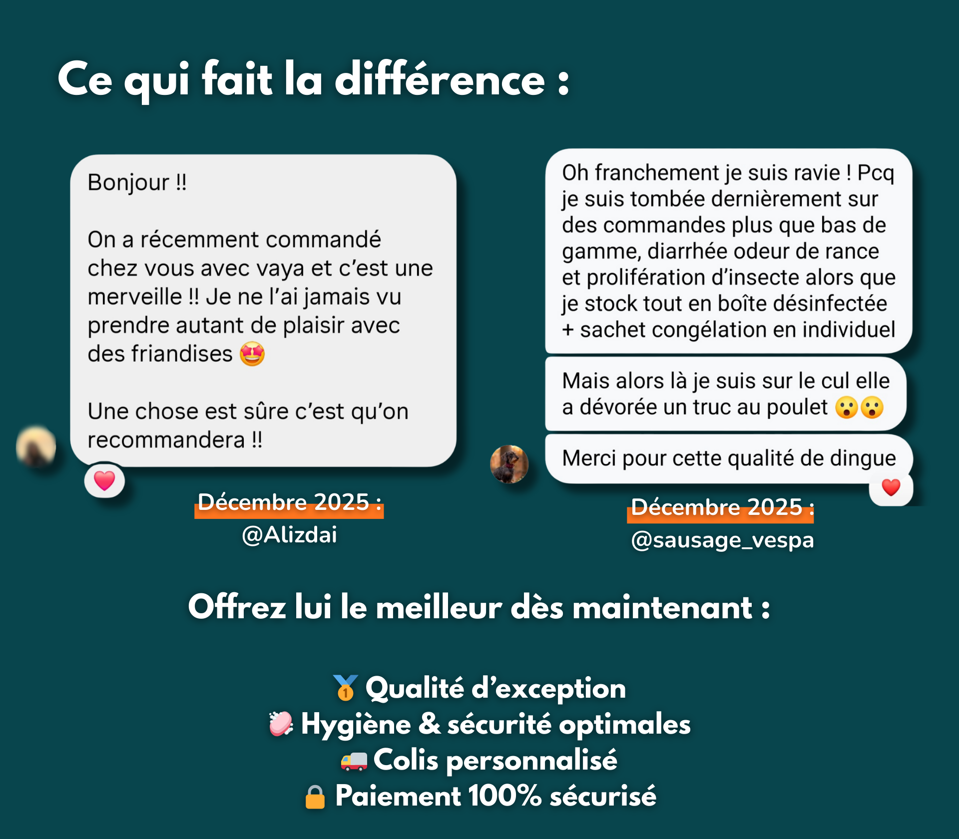 "I recently came across some orders from elsewhere that were more than just low quality: diarrhea, rancid smell and insect infestation! Vespa, who doesn't like chicken, has just devoured something with chicken on it! Thank you for this amazing quality!"